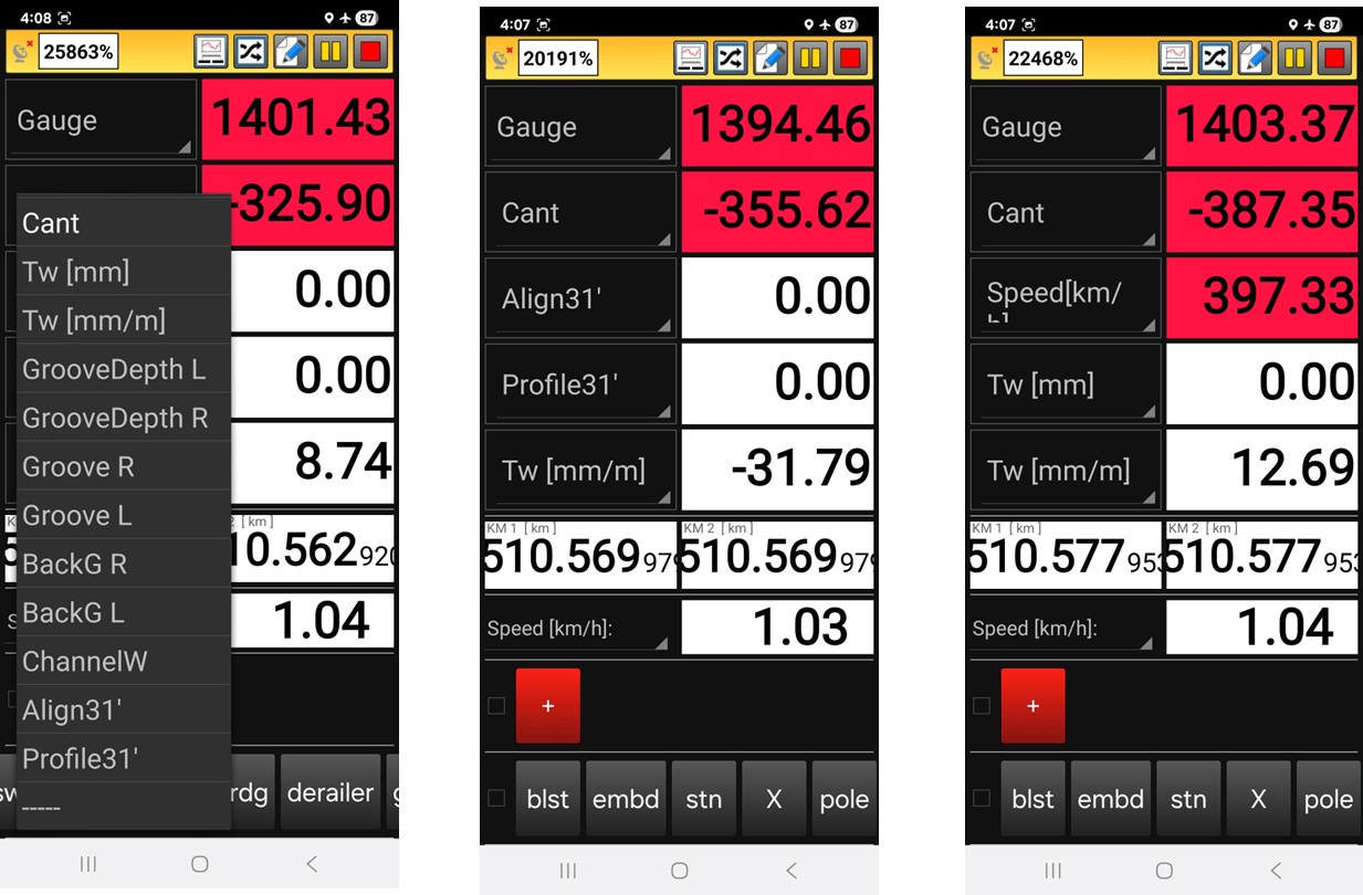 - + Display of battery life, GPS signal, inspection speed
